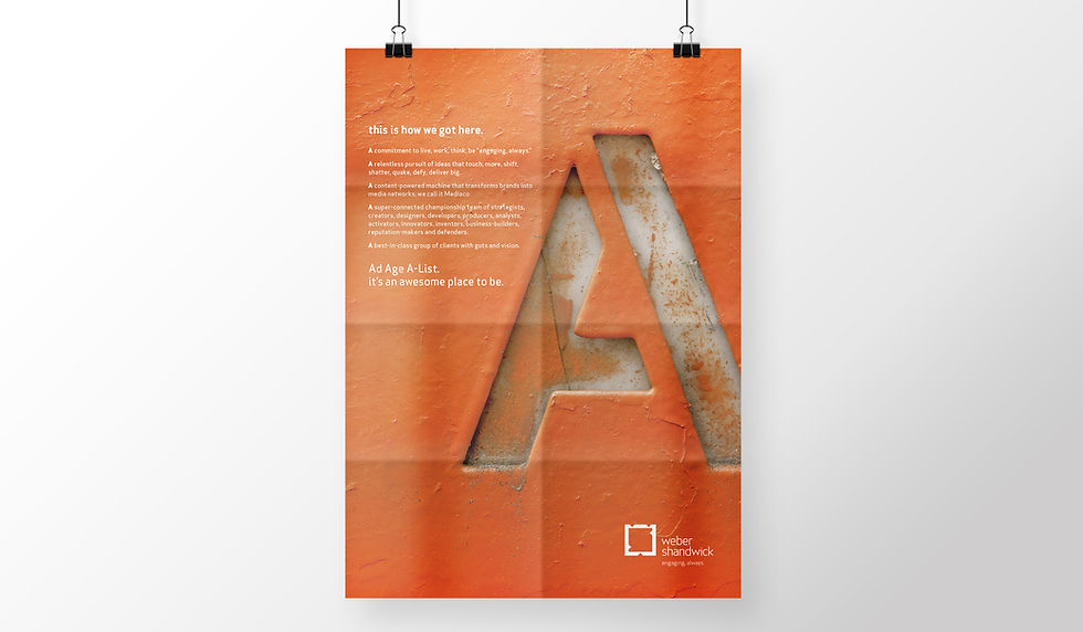 in the creative community but also racking up awards such as Advertising Age Agency A-List Standout: Honoring the industry's most innovative and successful agencies, but also winning Best Places to Work two years in a row. In an effort to both celebrate and spread the news within the PR and Creative industries, we designed a series of print and digital posters which were then translated to ads and web banners.